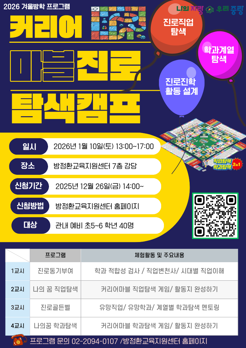 모집 : 40명 / 접수 : 45명2026년 겨울방학 예비 초5~6학년 대상 진로탐색 캠프