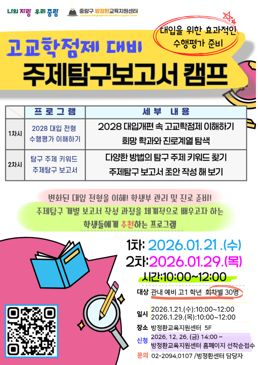 모집 : 30명 / 접수 : 35명[2026년 겨울방학] 1차 - 고교학점제 대비 주제탐구 보고서 캠프