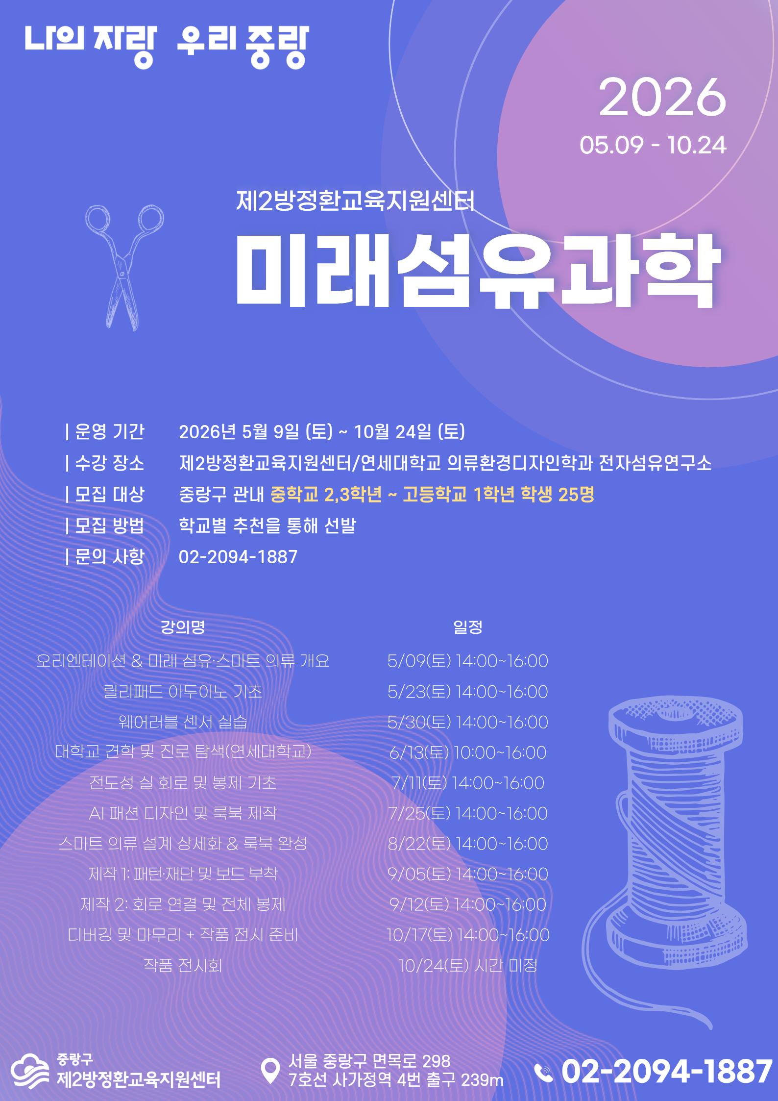 ✨ 수강 장소: 제2방정환교육지원센터 / 연세대학교 의상디자인학과✨ 모집 대상: 중랑구 관내 중학교 2,3학년 ~ 고등학교 1학년 학생 25명✨ 모집 방법: 학교별 추천을 통해 선발📍 장소: 중랑구 제2방정환교육지원센터 (사가정역 4번 출구 239m)